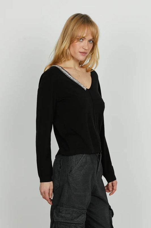Maglia LEVITA manica lunga scollo v con applicazione perline più strass RELISH