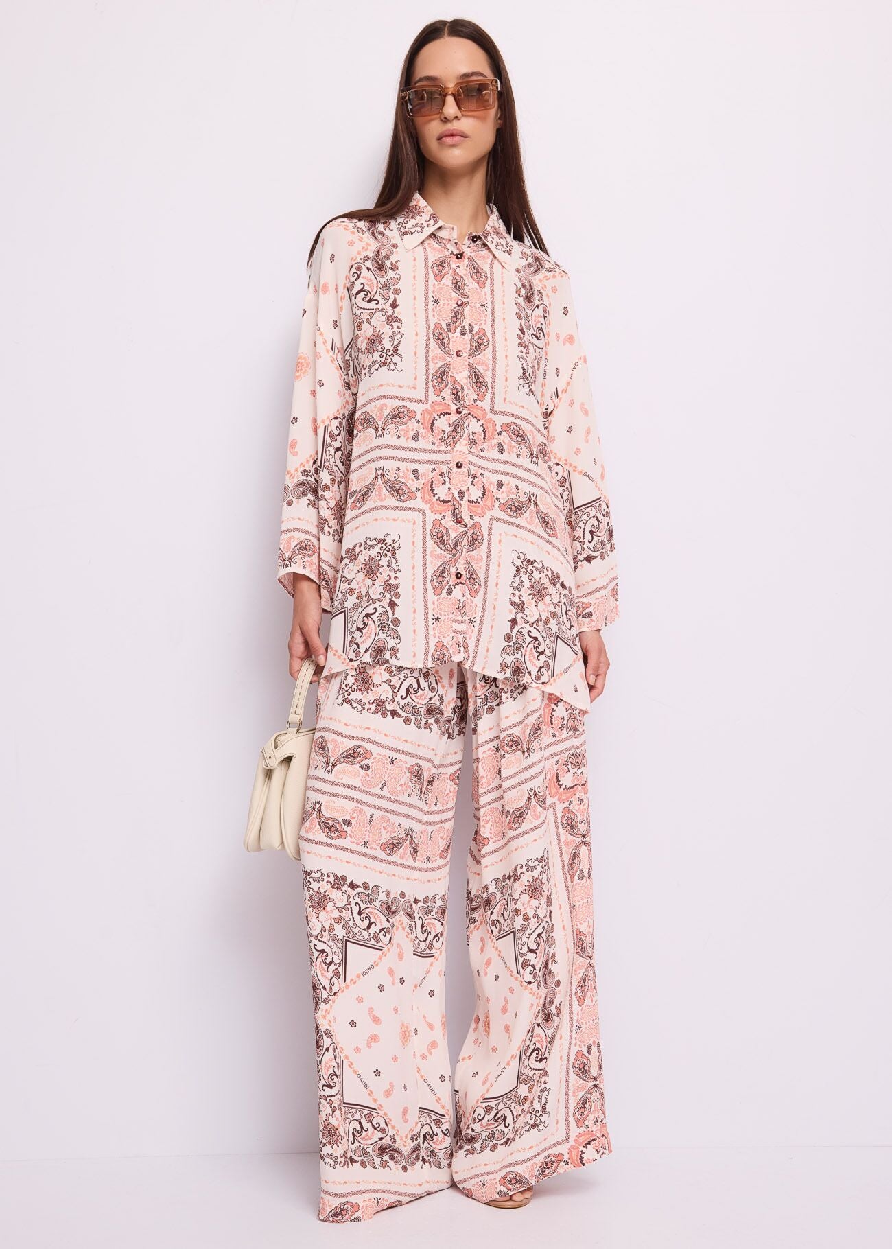 Choose the crepe shirt with a paisley print, classic collar, and long sleeves. Flowing and bright, it's a look with a boho-chic allure.