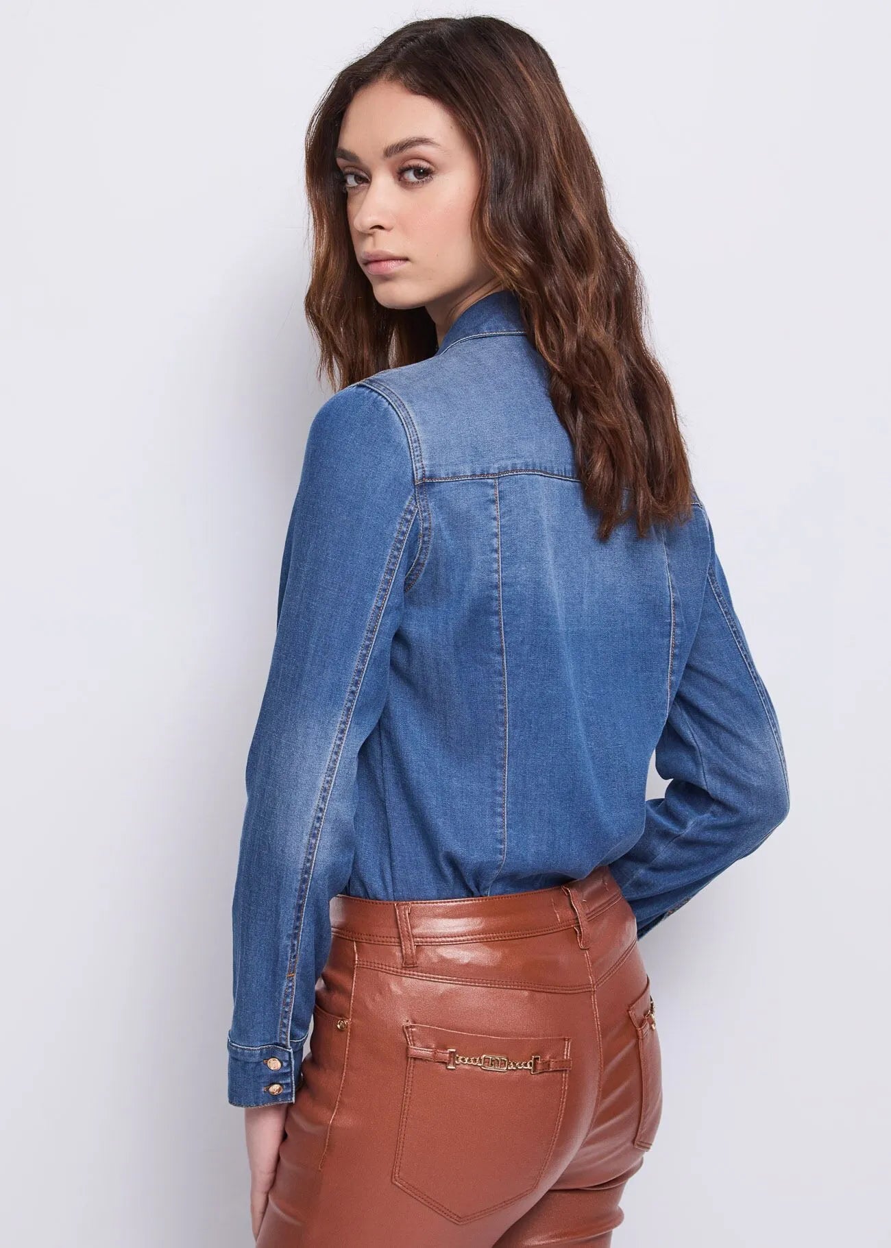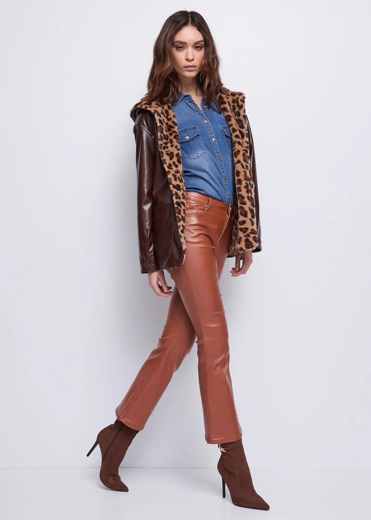 Per un outfit audace dal fascino glam rock, la camicia è perfetta da indossare con la giacca impreziosita da fodera animalier e denim jeans flare cropped effetto similpelle. Completa lo styling aggiungendo gli stivaletti in suede marrone con tacco stiletto.
