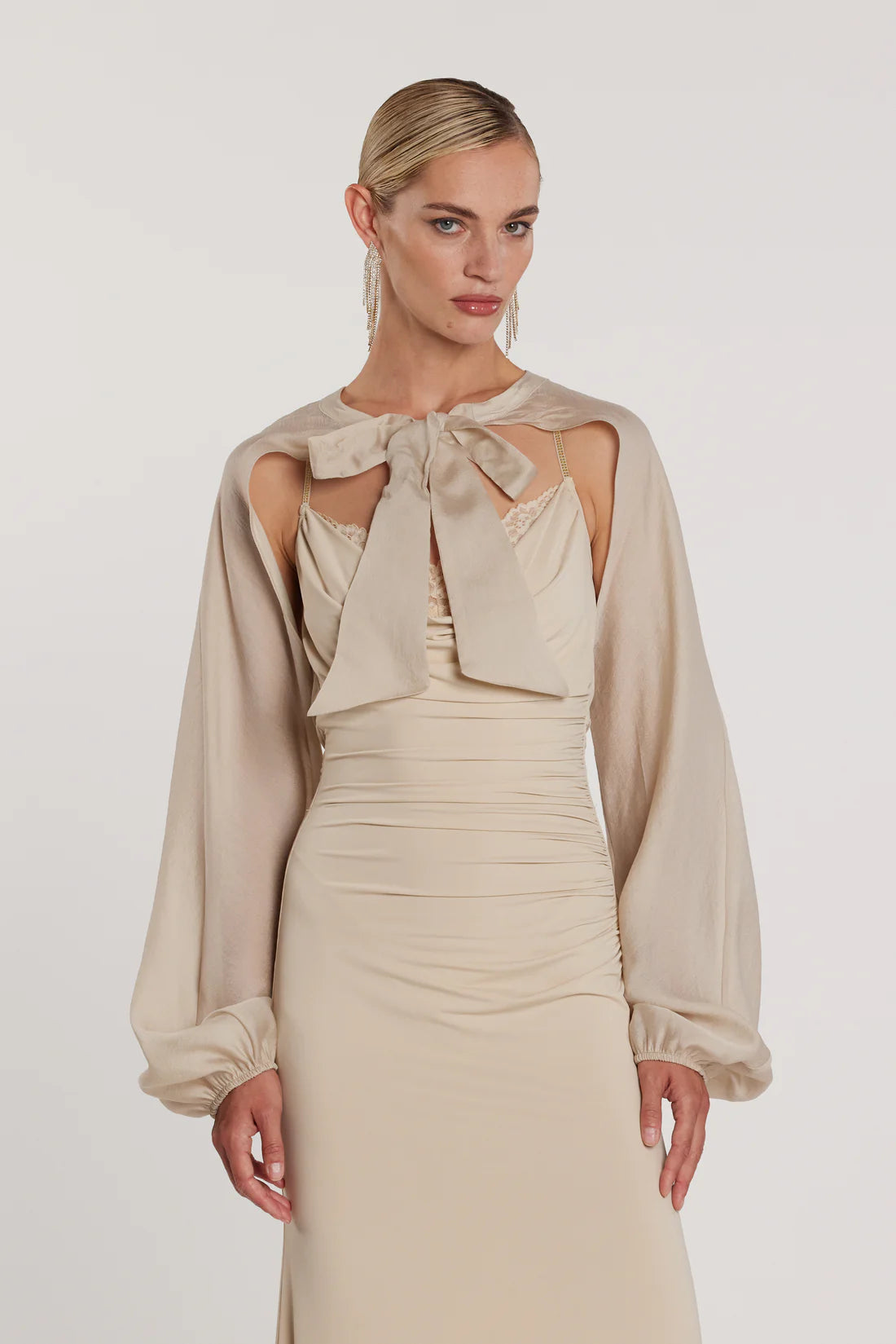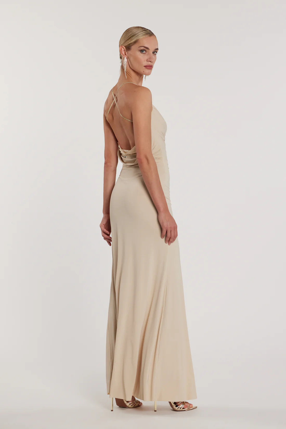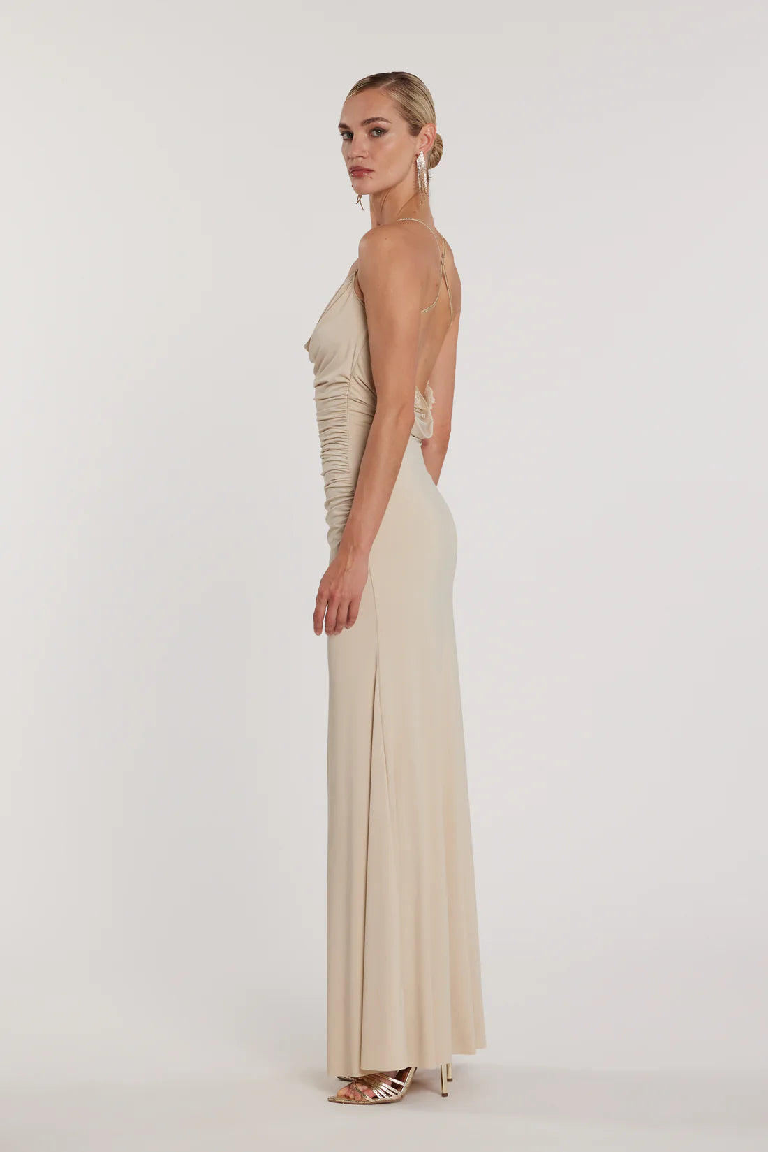 Abito Pampas_a lungo con scollo morbido, bretelle decorate da strass e dettagli in pizzo, un modello romantico e sofisticato. Perfetto per cocktail o eventi di gala, cattura la luce ad ogni passo, valorizzando la figura con eleganza e femminilità couture.