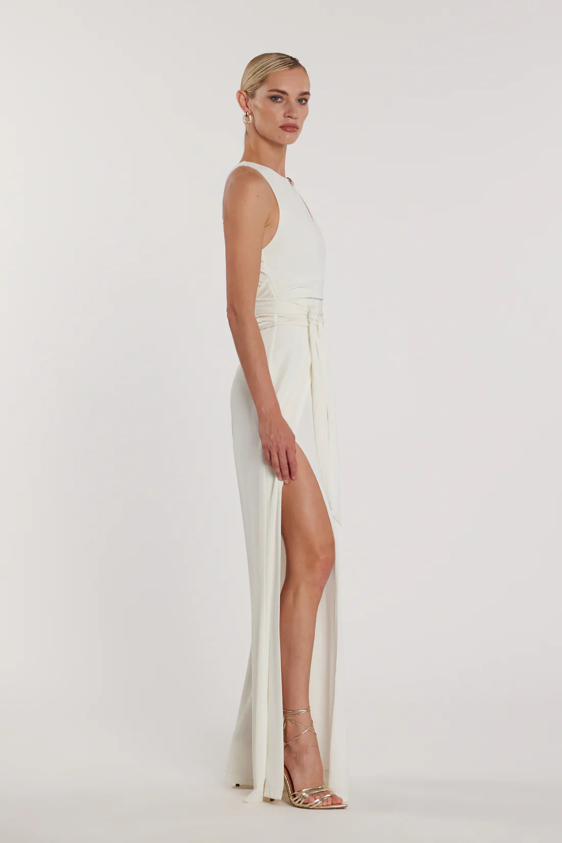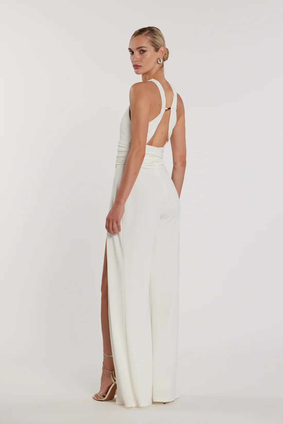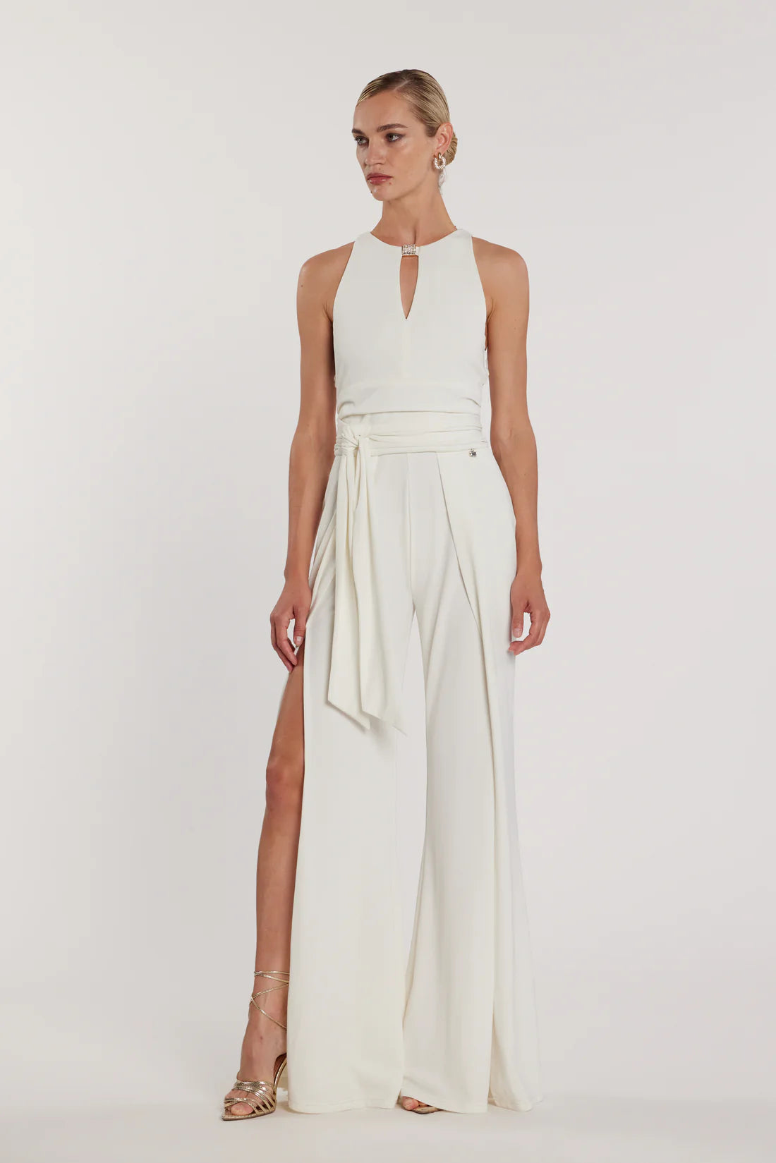Tuta Ponky_A a vita alta con pantaloni a zampa e spacchi, completa di cintura e accessorio coordinato. Un outfit sofisticato e di tendenza, ideale per look eleganti o serate speciali con un tocco moderno e femminile.
