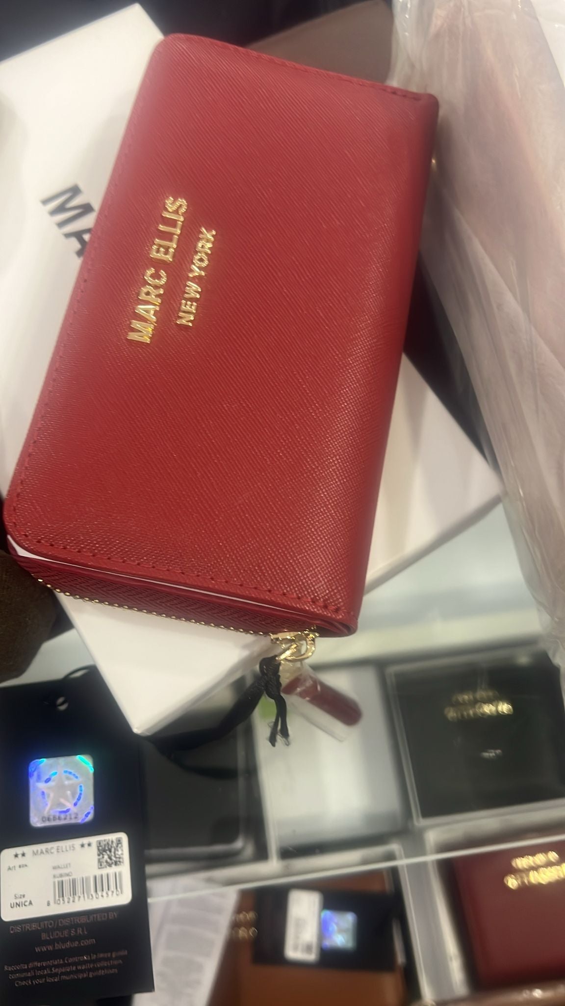 MARC ELLIS - Portafoglio in ecopelle rubino effetto saffiano con logo lettering in metallo sul davanti. Scomparto principale con tasca portamonete con zip, 2 scomparti per banconote e chiusura con zip all around. Organizer anteriore con scomparto per banconote, 8 slot per card e chiusura con bottone a pressione. Galvaniche canna di fucile. Dimensioni: 16,0 x 9,0 x 3,5 cm