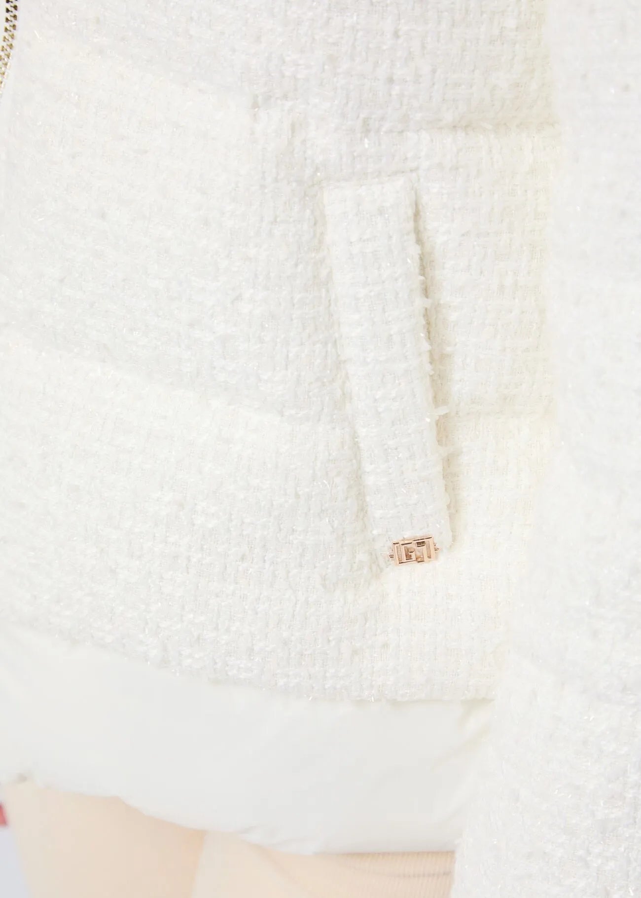 Scegli il piumino corto in nylon e tweed trapuntati con cappuccio e logo GJ in metallo. Design contemporaneo per un look elegante e confortevole.