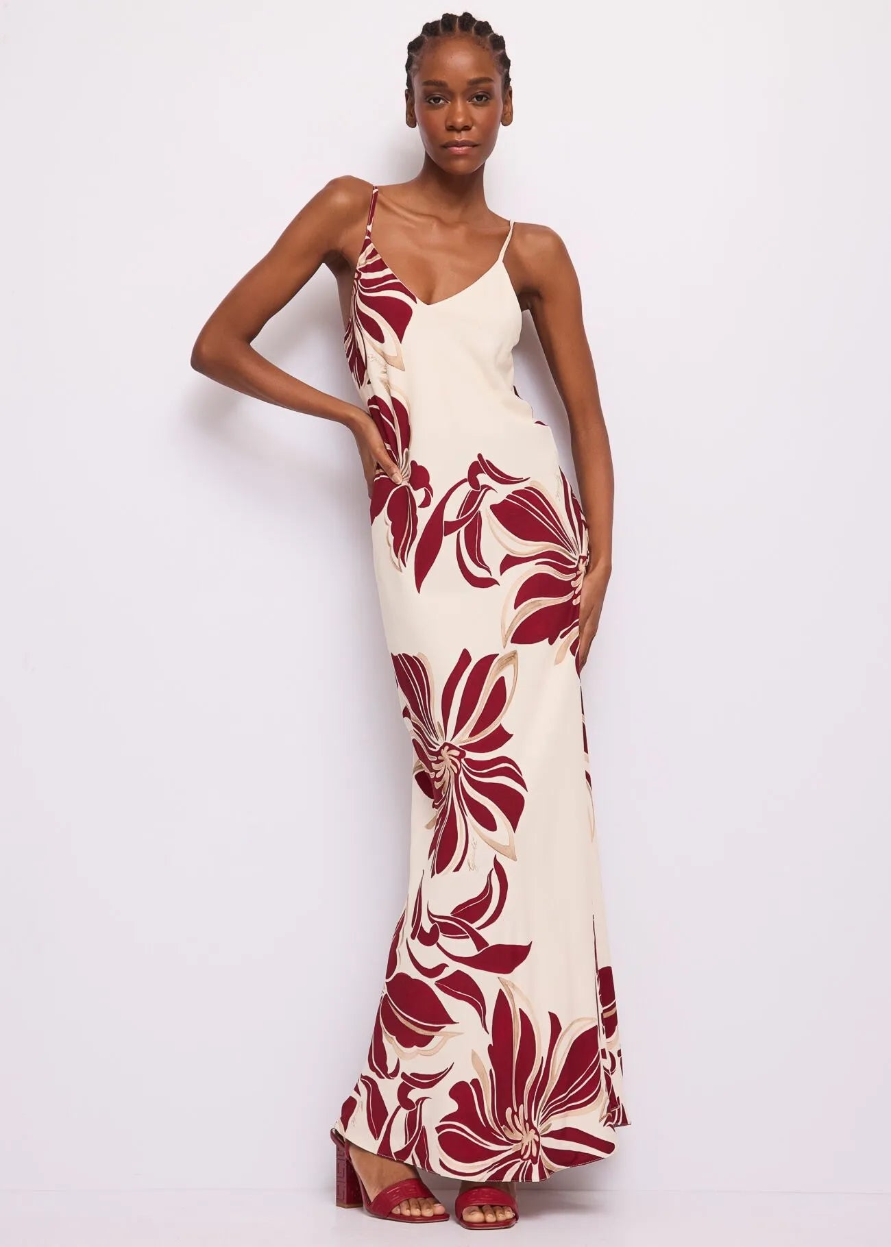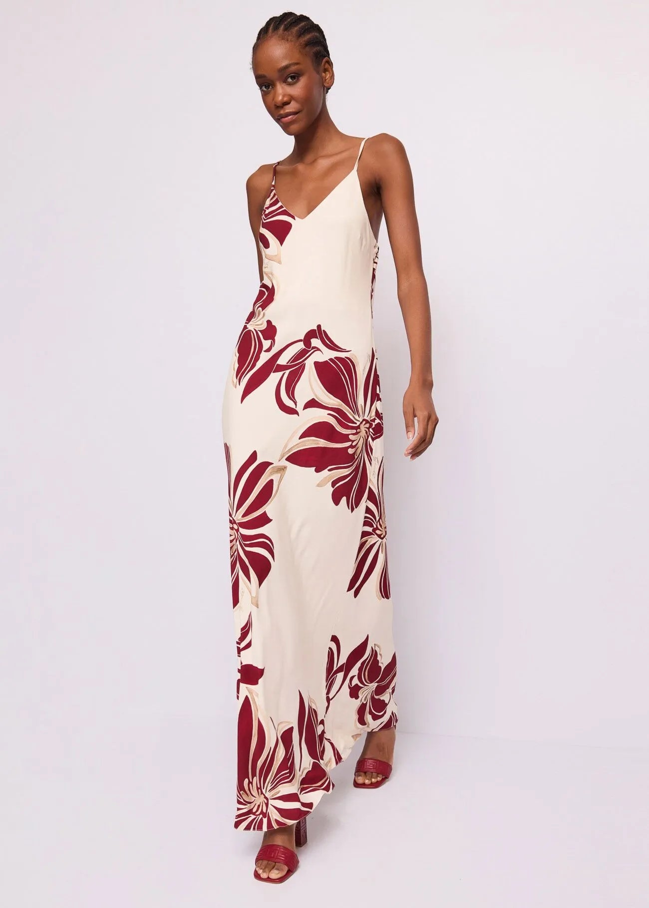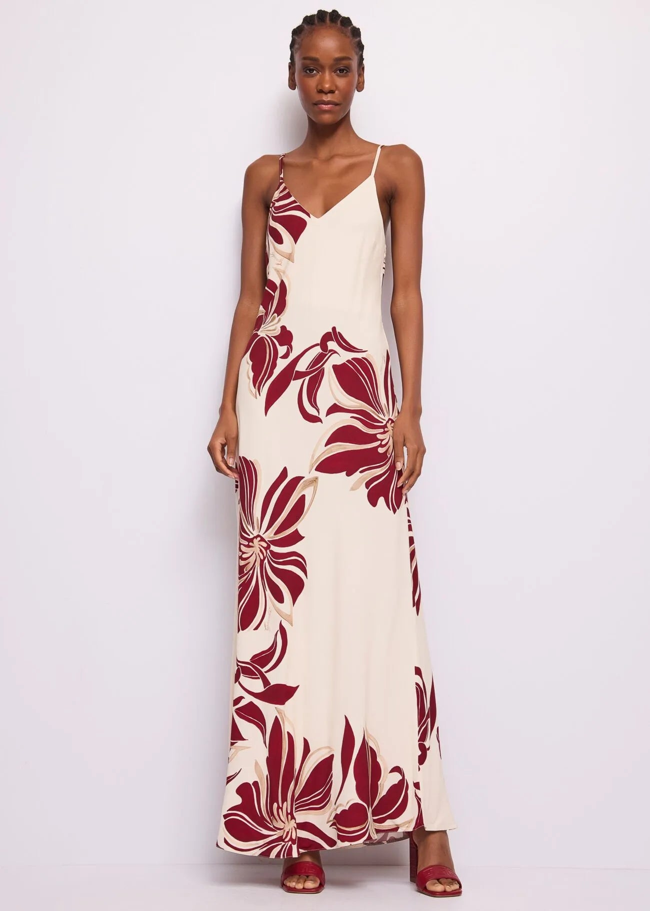 Scegli l'abito lungo in twill di viscosa con stampa floreale, scollo a V e spalline regolabili. Freschezza e leggerezza per un look raffinato.