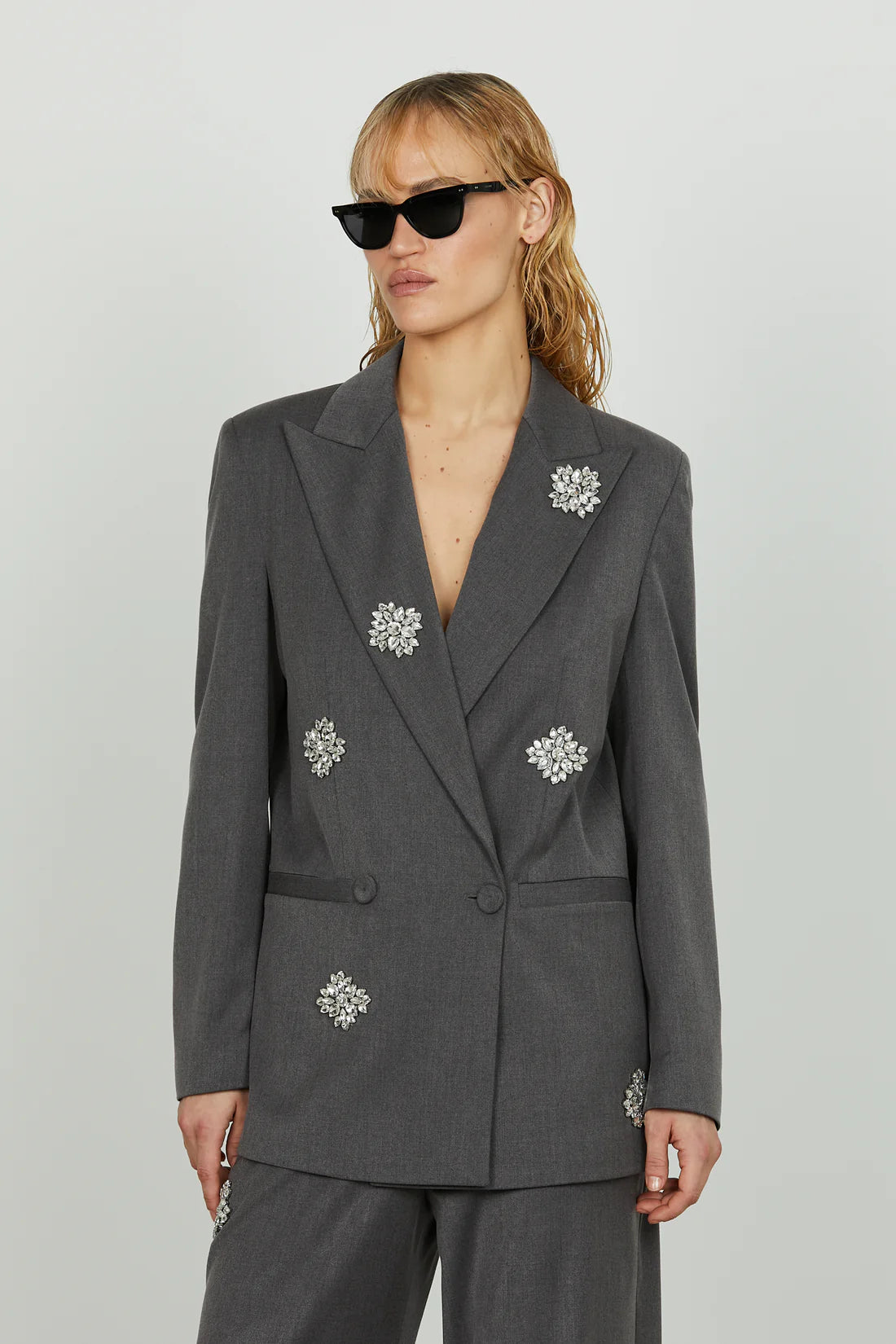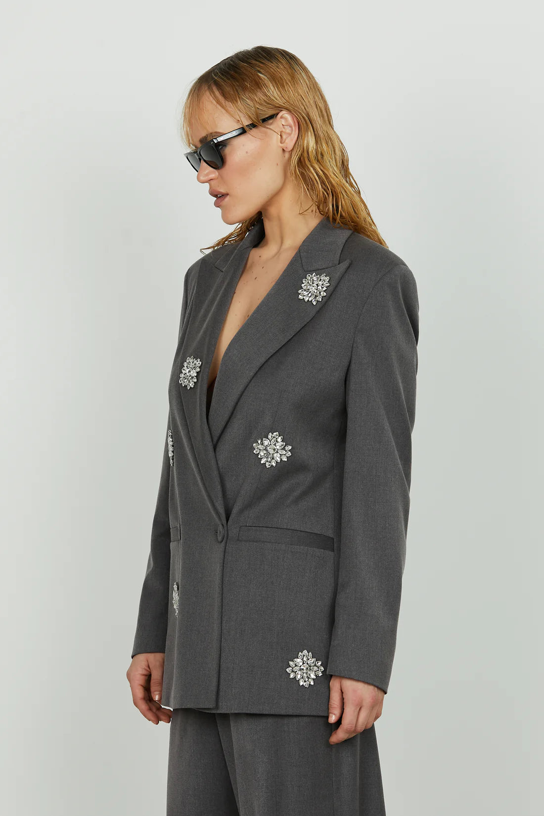 La Giacca DULEDA a doppio petto con applicazioni di fiori e strass è un capo che fonde l'eleganza classica con dettagli decorativi moderni. Il suo taglio medio-lungo e la struttura a doppio petto conferiscono una silhouette raffinata e strutturata, mentre le applicazioni floreali impreziosite da strass aggiungono un tocco di femminilità e brillantezza.