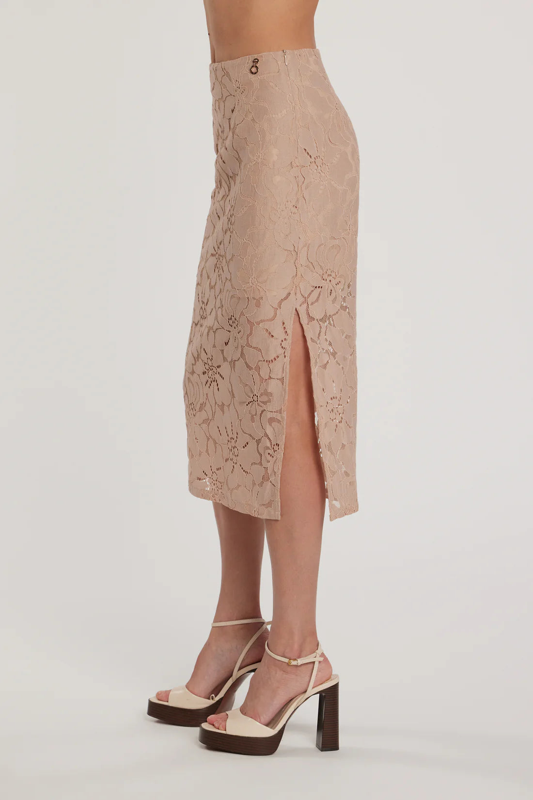 Longuette Adela vita alta con spacco in pizzo, un modello femminile e sofisticato. Il pizzo crea delicatezza e movimento elegante, mentre la linea a vita alta valorizza la silhouette con charme couture discreto.
